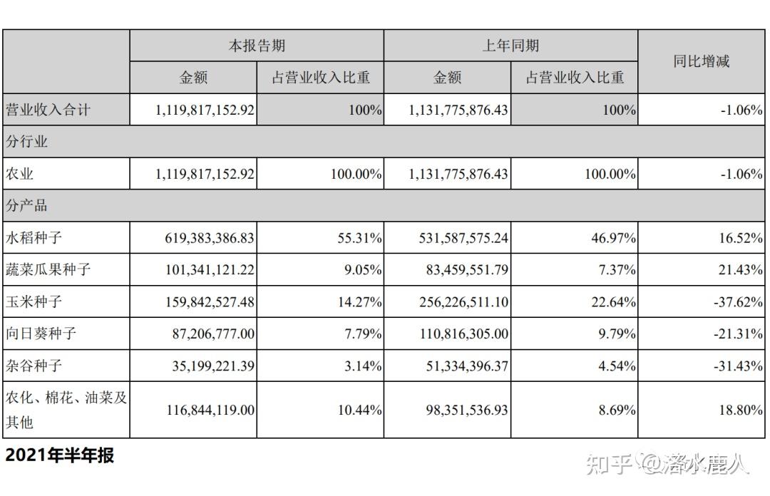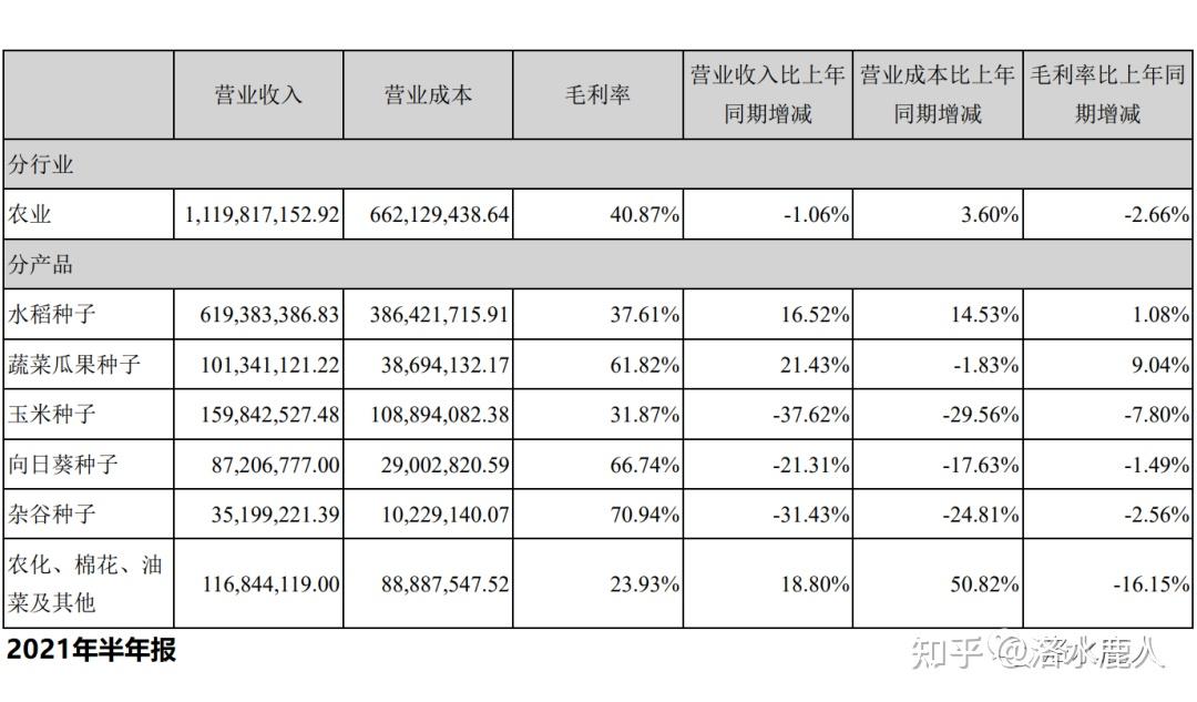 根据 2021 年半年报,公司营收占比最高的板块为水稻种子,比重为55.31%,毛利率为 37.61%;营收比重排名第二的为玉米种子,比重为 14.27%,毛利率