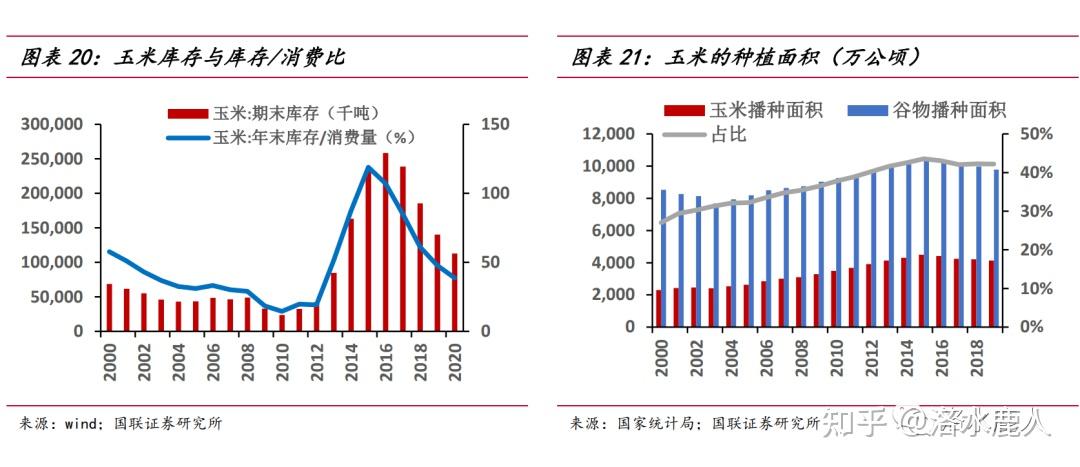 玉米的周期波动主要来自临储政策。2008 年金融危机之后,为保障粮食安全,国家开始推行玉米临储政策。种植户积极性上升,价格、播种面积、库存持续攀升。2008 至 2015 年,我国玉米播种面积从 4.65 亿亩上升至 6.75 亿亩,库存从 0.49 亿吨上升到 2.37 亿吨;2016 年临储政策取消,价格、播种面积连年下滑。2015 至 2020 年,播种面积从 6.75 亿亩回落至 6.32 亿亩,库存回调至 1.13 亿吨。2020 年,玉米库存消费比已下滑至 38.75%,临近库存安全线下限。